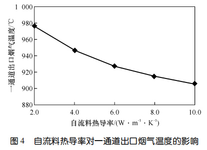 SiC 自流料熱導率對一通道出口煙氣溫度的影響圖4示出了自流料熱導率對一通道出口煙氣溫度的影響。可以看出,爐襯各工作層厚度固定時,一通道出口煙氣溫度隨自流料熱導率的升高而降低。通過調整自流料熱導率,一通道出口煙氣溫度差值高達 70 ℃。