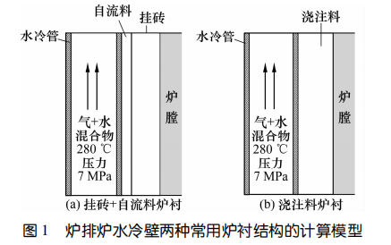 國內外爐排爐在水冷壁內襯結構設計上有較大差別,國外爐排爐水冷壁內襯結構為鰭片(扁鋼)掛釘+SiC掛磚+SiC自流料填充密封,簡稱膜式壁結構;國內則為水冷管錨固釘+SiC澆注料結構。不同的爐襯材質和結構對水冷壁內襯傳熱有較大影響,目前尚未見爐排爐水冷壁內襯熱傳導研究報道。